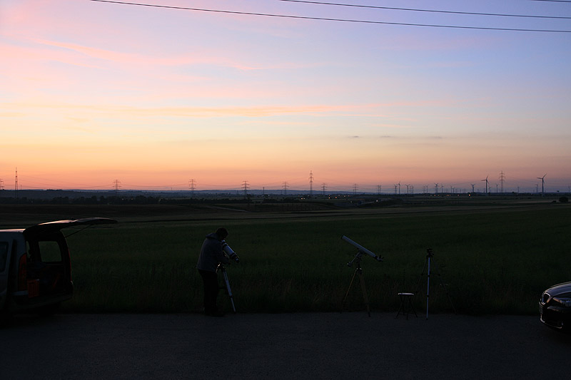 Nachdem ich bereits den Venustransit 2004 bei sehr gutem Wetter und mit fantastischen Optiken in Brandenburg beobachten konnte, hatte ich auch beim zweiten Transit 8 Jahre später wieder Wetterglück. Nachdem mich der Wecker um 2:59 Uhr aus dem Bett geholt hatte konnte ich bereits den klaren Dämmerungshimmel bewundern. Kollege Wolfgang Vollmann hatte im Weinviertel nahe der Wiener Stadtgrenze ein gutes Plätzchen herausgesucht, von dem sich bereits der Sonnenaufgang gut verfolgen lassen sollte.